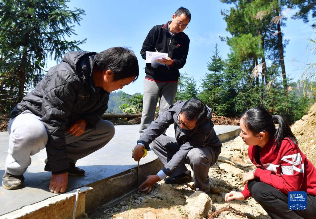 在广西壮族自治区柳州市融水苗族自治县良寨乡培洞村,纪检监察干部(右一、二、三)在检查扶贫道路施工情况(2019年11月5日摄)。新华社记者 黄孝邦 摄